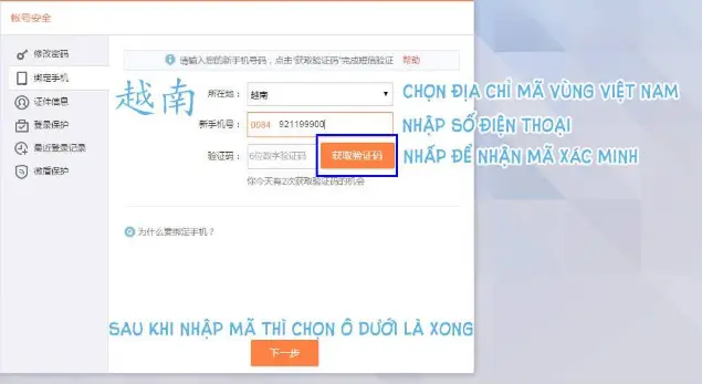 Bước 3: Nhập số điện thoại để xác minh Weibo. Chọn địa chỉ mã vùng Việt Nam rồi nhập số điện thoại. Sau đó nhấn nút màu cam để nhận mã xác minh.
